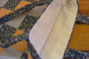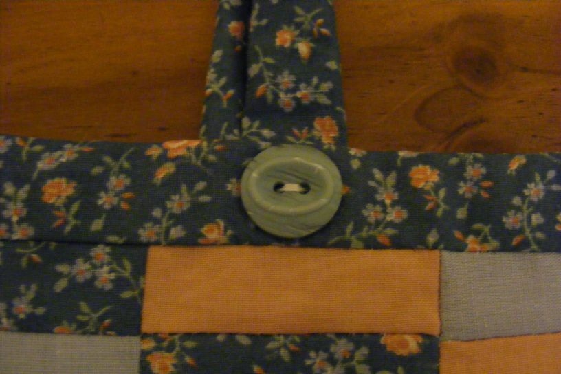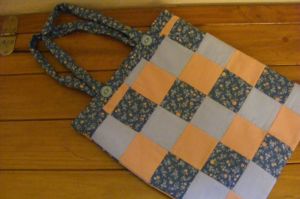 I’ve spent the past few days working on a few more bag designs, and have managed to finish two. Here they are – the first one is a patchwork mini tote, large enough to hold a student’s A4 papers, or a knitting pattern, needles and wool. It’s entirely hand-stitched, and lined in cotton. The fabrics are vintage cottons, and it’s finished with four marbled buttons.