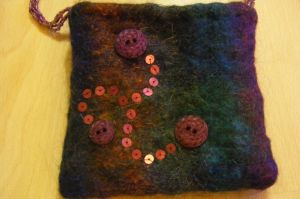 The other bag was felted from a mohair and wool scarf, originally hand woven in Scotland. It’s decorated with sequins and buttons, and lined with purple cloth. The handle is an old beaded necklace.