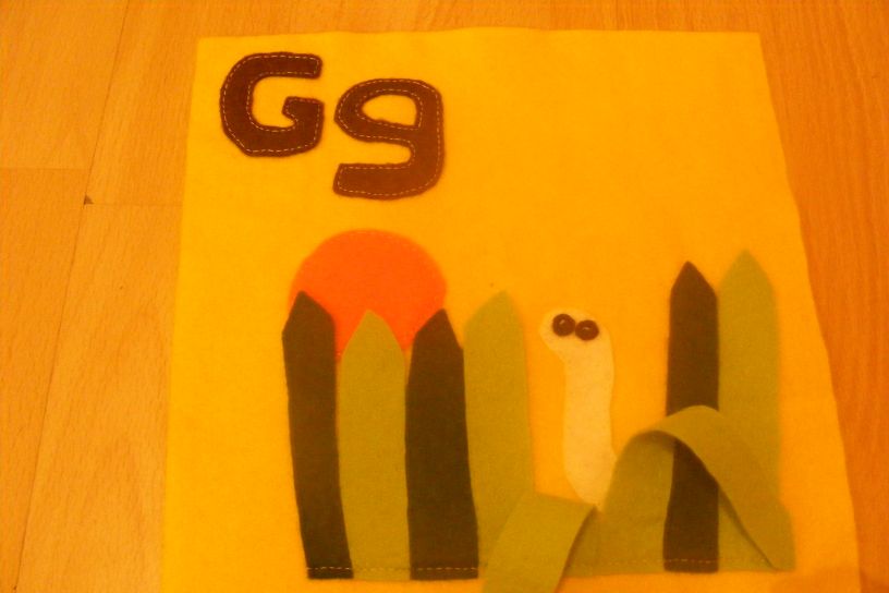 G is for Grass. There’s a little worm hiding behind the tall grass, for children to find.
