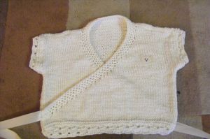 I’ve been knitting away busily since 2010 started, finishing off some of those WIPs that have been lingering in my living room. First up was a little bamboo cardigan for H, which I cast on months ago! The pattern called for a knitted edging and ties, but I couldn’t be bothered knitting five stitches for ages. Instead, I edged the cardigan with several rows of double crochet, and added ties of ivory satin ribbon. Then I sewed on a little teddy bear patch to finish it off.