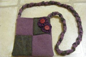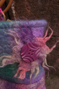 I decorated it with a bit of the felted fringing from the scarf, with a lovely purple button as a centrepiece.
