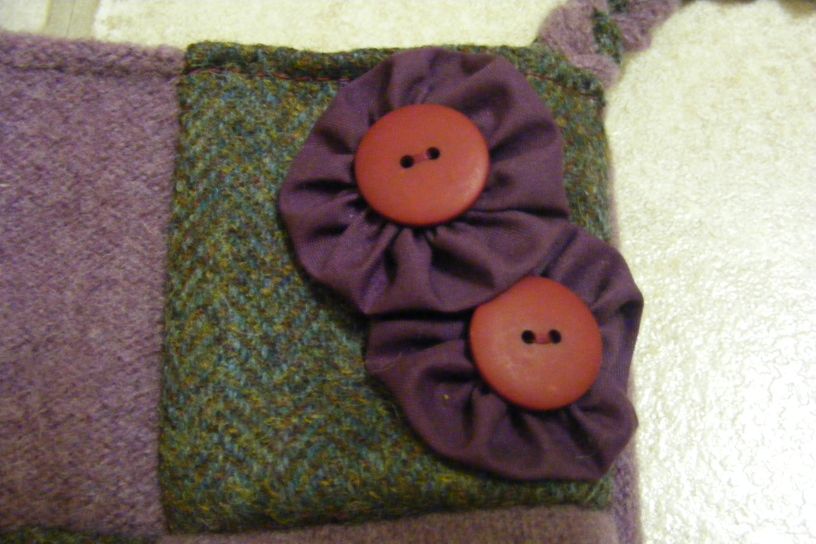 It’s made with a gorgeous heathery purple felted sweater and some grey tweedy fabric, with a purple cloth lining and plaited handle. I enjoyed learning the yo yo technique, and I can see that they could be very addictive – I’m tempted to add them to everything!