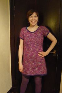 Remember this post a few weeks ago, when I talked about my plans to make a sweater dress with some appallingly bright and sparkly purple yarn? Well, I’m currently wearing the finished result!
