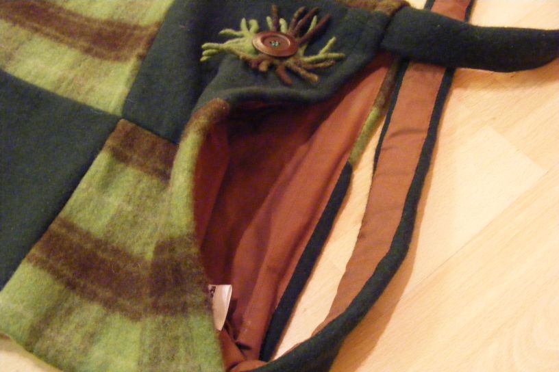 The first one is created from a Ted Baker scarf and a man’s jumper, plus an old bed sheet. I made a sort of star-like corsage with the felted fringing from the end of the scarf, and finished it off with a big wooden button.