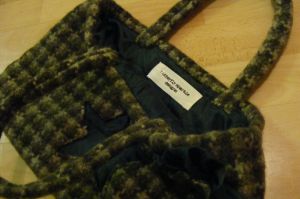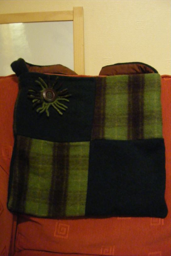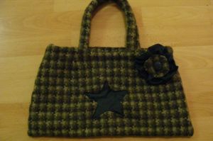 The second bag started life as a tweed skirt, felted and transformed into a cute little handbag. I made a yo-yo corsage and finished it off with a mock leather green button and a felt circle.