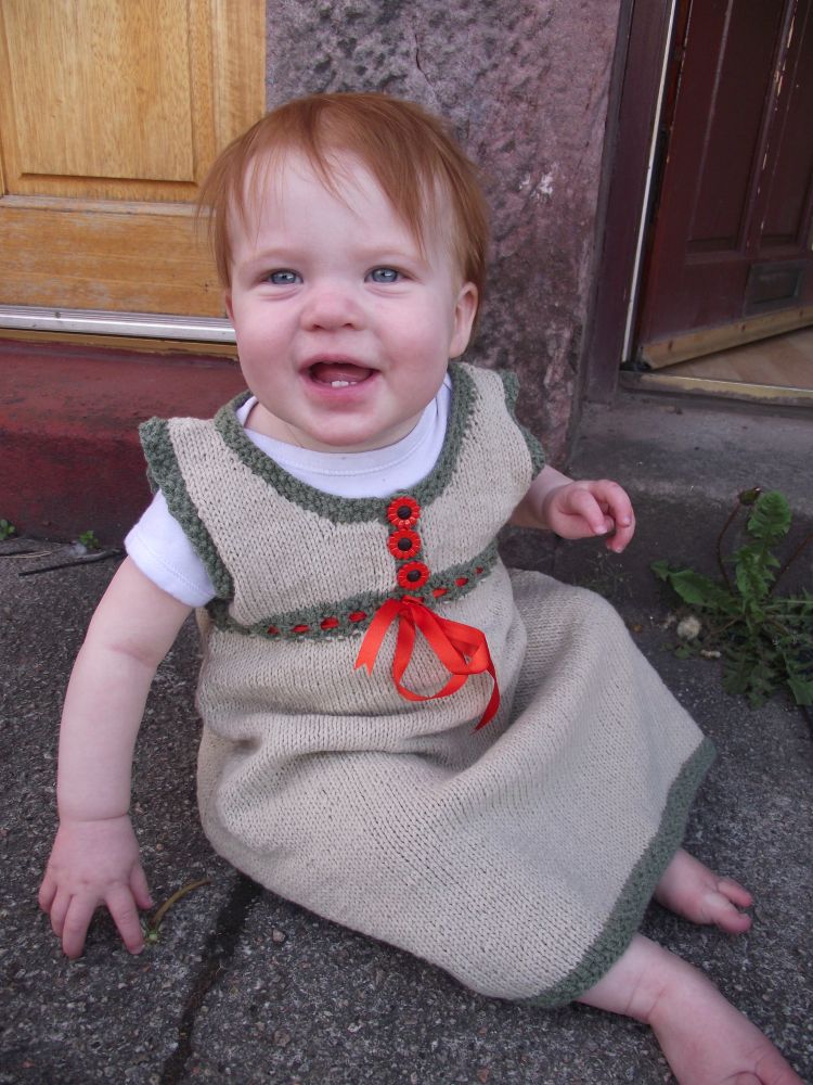 I knitted the dress in stash yarns – Sirdar Calico for the main colour, and James C Brett Kool Kotton for the contrast. I try to avoid excessive pink, especially as she’s such a little gingernut, and this dress can be worn with her big brother’s old khaki t-shirts. As you can probably tell, she loves it!