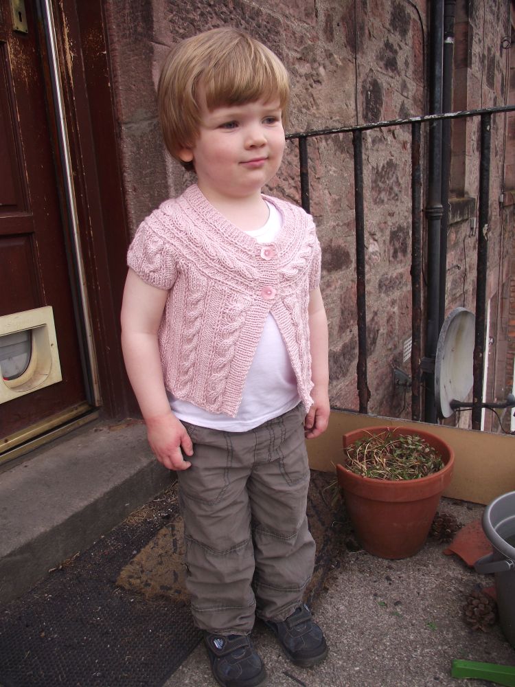 This is a little cabled swing cardigan that I made for one of my son’s friends. It’s a size 4-5 but fits him, and he’s just turned 3. You can’t see the detail too clearly in this picture as it’s such a light coloured pink yarn, but it’s a very pretty cabled design. The yarn is Sirdar Baby Bamboo, and the pattern was in Knitting Magazine last November.