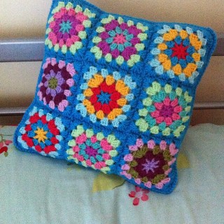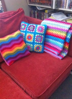 I finally found something to make with my leftover yarn from the giant Granny Stripe blanket! Using Attic24’s Summer Garden granny square pattern, I crocheted 18 squares in a variety of colours, and then edged them all with bright blue. The finished result makes me very happy, and my sofa is slowly becoming more and more colourful and cheery. However, I’ve still got a huge number of leftovers, so I’ve started on the second cushion – watch this space for more bright and colourful pictures!