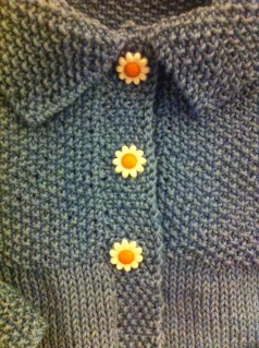 I knitted this one in Patons 100% Cotton 4ply from my stash, and the whole jacket used only one ball of yarn in a 6-12 month size. It’s quite a time-consuming knit, but I think it’s worth it. I really like the textured feel of moss stitch. These daisy buttons are cute too! I’ve started knitting some baby hats with more of my stash, so hopefully the three boxes of yarn will be decreasing in size very soon.