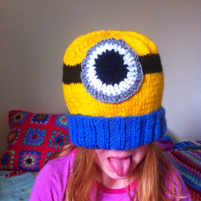 I absolutely love the Despicable Me films, mostly because of the adorable little minions – who are apparently getting their own movie soon! Last year, I did a lot of minion related knitting and crochet and this week I was asked to make another minion hat for a friend. It’s a really easy knit, and fits most sizes of children and adults. The eye is crocheted and sewn on later, and the pattern has instructions for embroidering a mouth as well, if you fancy. Here’s my daughter modelling it, with a classic minion expression!