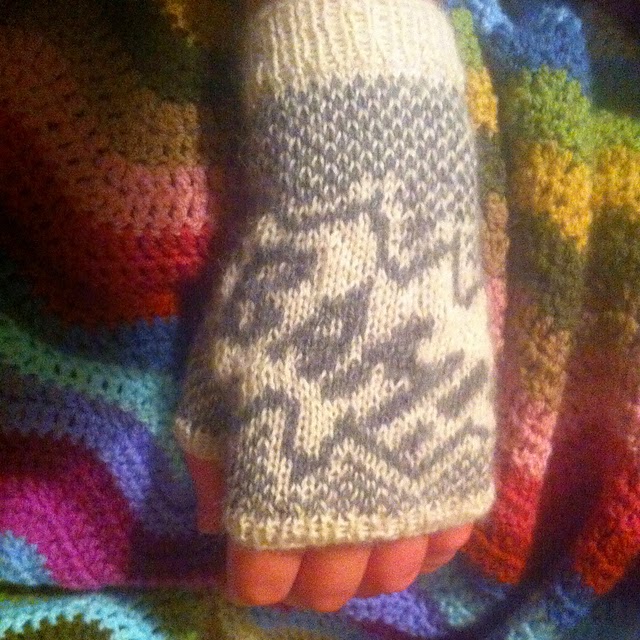 Halfway through the Sanquhar knitting I felt like I needed a little break, so I made these fun fingerless mitts for my friend. He wanted something a bit different and superhero related, but I didn’t have much luck finding a suitable pattern. These gloves jumped out at me because they were pretty fun, but not too “novelty” to wear to the office. The pattern is Fightin’ Words by Annie Watts, and I used some of my new Drops Alpaca yarn. It’s so soft and fuzzy, but the pattern was still quite defined. I found the charting really easy to follow, and I also liked the fact that the design can look so effective in lots of different colour combinations.