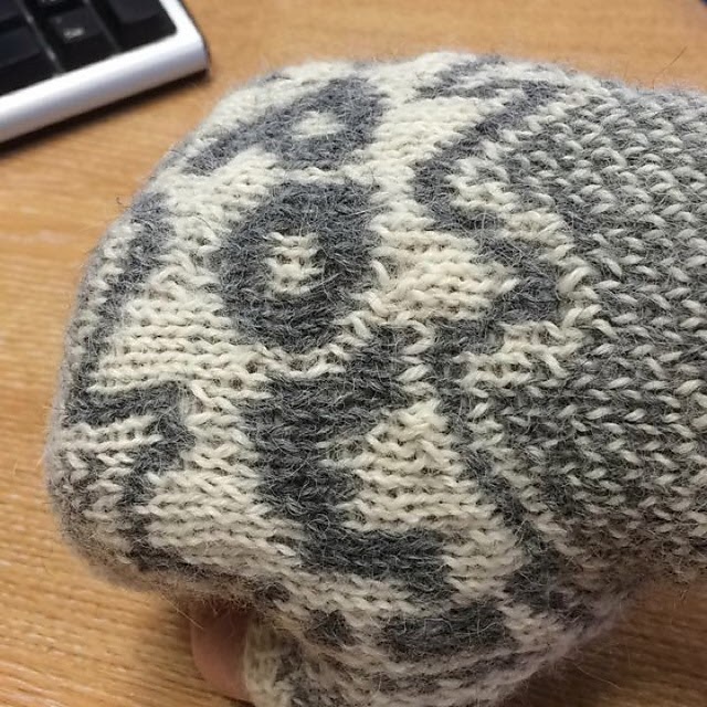 These gloves are the Duke design, and the pattern is a traditional one from the village of Sanquhar in Scotland. You can buy the patterns from the Women’s Institute in Edinburgh, and if you get the chance it’s definitely worth visiting Sanquhar itself to see the knitting on display in the museum.