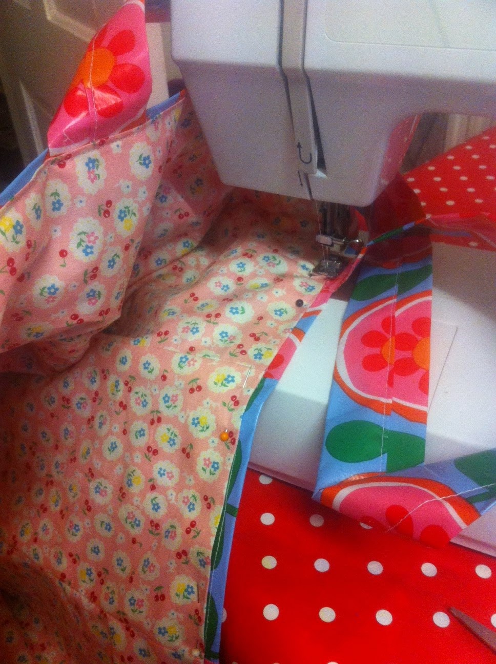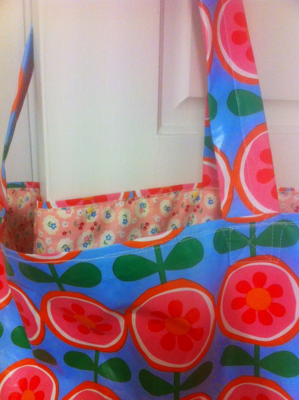 This oilcloth was a tablecloth which I bought in Tiger, a sort of IKEA-style shop which sells really cute homewares and toys. I wanted to make a large shopping bag, so I had a good look through my fabric stash and found some printed cotton which would work as a lining. I’ve been watching the Great British Sewing Bee recently, but my sewing method would not have lasted long on that show! I didn’t iron my fabric before cutting, I didn’t measure anything, and I shoved everything under the sewing machine and hoped for the best!