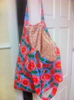 I’m quite happy with the results though – a large shopper with sturdy handles, slightly messy top stitching round the bag opening, and a pretty lining.