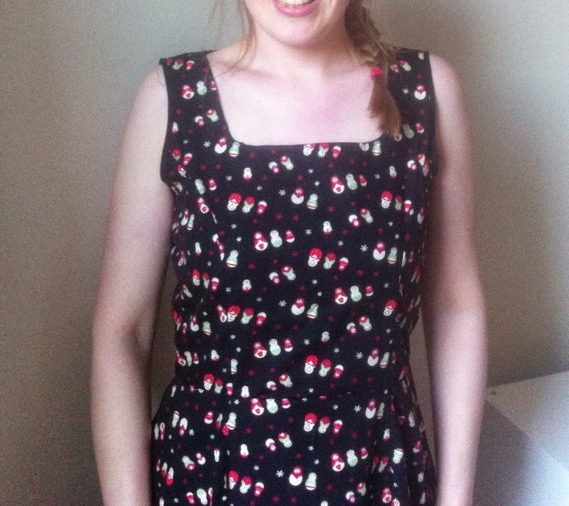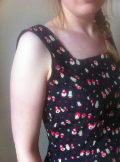 Finished! I put the dress on – and then realised that all my bad dressmaking had produced a garment that just didn’t work. The bodice was baggy and gaped at the armholes, and I couldn’t see a way of fixing it that didn’t involve unpicking two hours worth of bias binding. Eventually, after a lot of pinning and swearing and frowning into the mirror, I came to a solution. When I sewed all the pieces together, I’d actually overestimated how much weight I’d put on, and made the whole bodice at least a size too big. I stuck the dress back under the machine, and resewed most of the seams with the correct seam allowance. Unfortunately that meant that the armhole binding needed to be inside the seam in places, and it took a lot longer than if I’d just done it properly in the first place, but I ended up with a wearable garment.