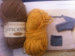 On Saturday evening I spent an hour going through my yarn stash, picking out a few nice balls that I wanted to use up, and matching them with patterns. I’ve started with the Noah sweater from “What To Knit When You’re Expecting”, using some Freedom Sincere Organic Cotton DK, and some Rowan Purelife Organic Cotton DK. This stuff knits up beautifully, it’s really soft and smooth. The pattern is pretty easy, so I’ve knitted the back and front of the sweater already. Here’s a wee sneak peek!